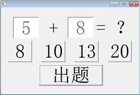 每次点击“出题”按钮,随机取出两个 100 以内的整数分别放在上部左边两个编辑框,中间随机取出加号或者减号运算符,当中间为减号运算符的时候,让左边数字必须大于等于右边数字,设置好题目后,随机生成三个错误答案和一个正确答案,答案随机显示在中间四个按钮上。此后点击“答案”按钮,然后答案按钮上的内容显示到“?”位置,如果选择正确,“?”位置文字颜色变绿,如果选择错误了,“?”位置文字颜色变红,答题结束后,点击“出题”按钮再次开始游戏。