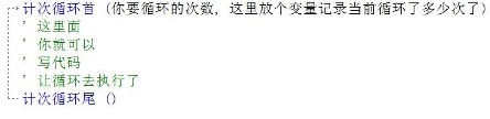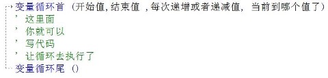 让你从 15 数到 55,这样的重复性的工作,因为并不是从 1 开始,所以这样的用计次循环就比较麻烦,我们可以用另一个类似的循环——变量循环。变量循环就是从指定的开始值按照你设定的每次递增或者递减的值循环到你指定的结束值,在这个循环中做什么呢,你让它做什么它就做什么。