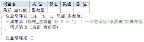 比如你想求出 14 到 79 之间的所有奇数,并且把这些数在易语言输出显示一下,可以如下: