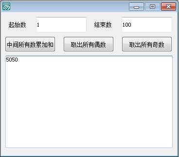 点击“取出所有奇数”后,循环从“起始数”到“结束数”中间的所有整数中取出奇数,显示在下面的编辑框中,每个数中间用逗号分隔开。